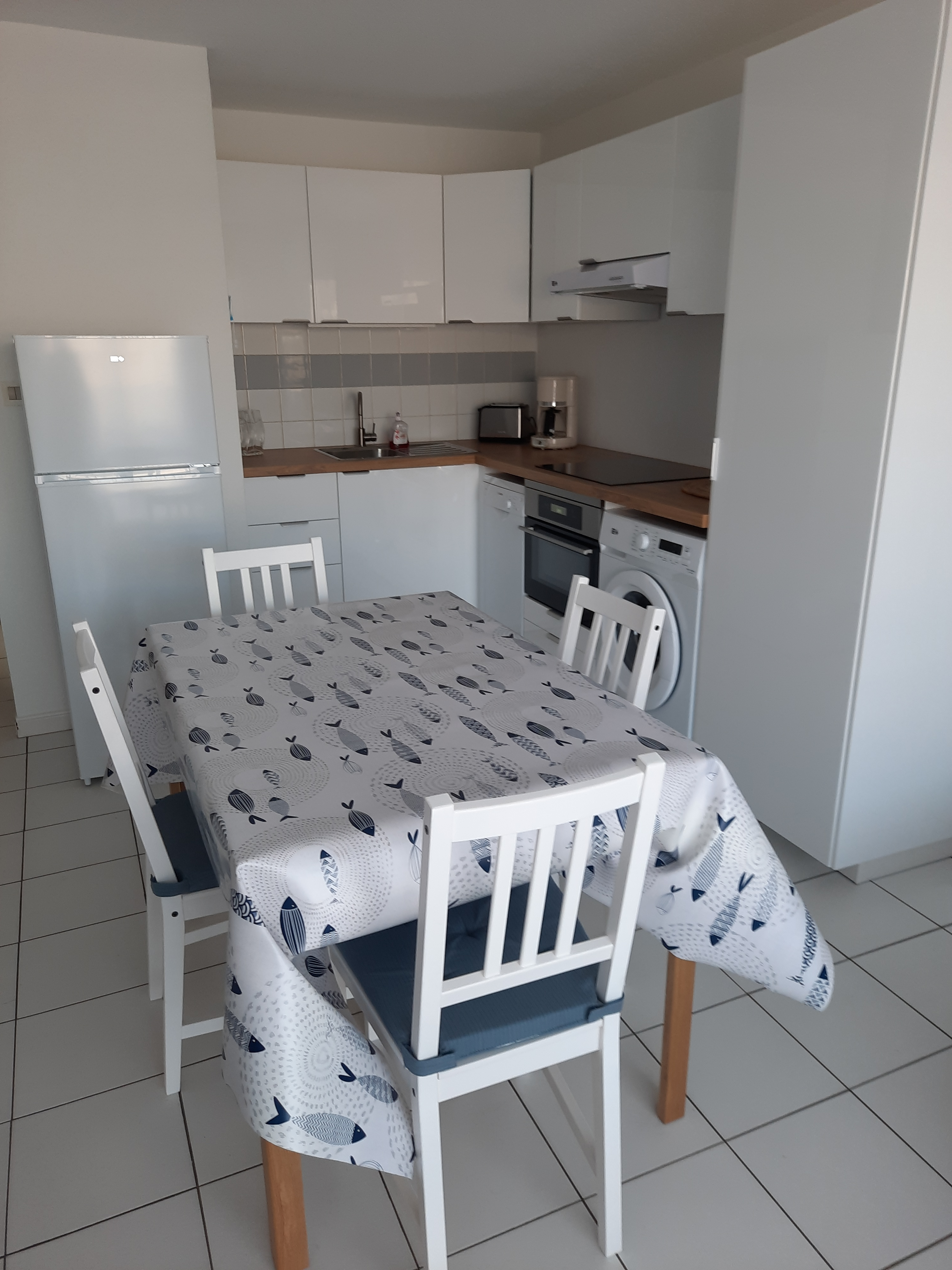 Pièce principale avec coin cuisine équipée (réfrigérateur, plaques de cuisson, micro-ondes, évier, rangements, vaisselle...), 1 séjour/salon avec écran plat et canapé couvertible (2 couchages), 1 douche et 1 WC séparé, une chambre enfants avec 2 lits superposés et une chambre adultes avec un lit en 1.40 m.